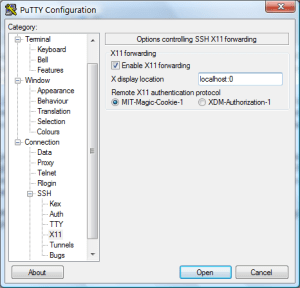 Install Xming and run it. When Xming is running you will see an ‘X’ icon in the system tray. The default settings will do fine for our purposes here. The only tricky part is configuring Putty. We need to enable X forwarding and set the display variable to localhost:0. You’ll have to drill down to get to the setting as shown below.