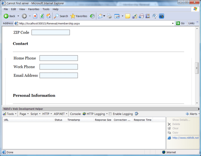 As icing on the cake, my old development plugins were installed just like they were before the new IE development tools were available. See the above screenshot showing the layout bug, along with Nikhil’s Web Development Helper loaded at the bottom of the screen. I wonder if IEDocMon will work as well?