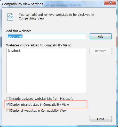 After the demo we looked more closely at things and discovered that a default setting in IE causes things to display in compatibility view when the page is an ‘intranet’ site (which appears to include localhost). Here is a screenshot: