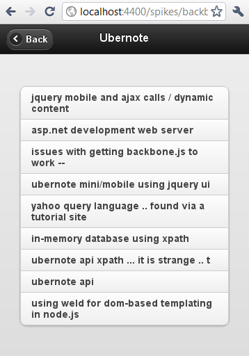 Followers of my blog may recall a project that I created almost a year ago called Jath, which is an XML-to-JSON conversion library that works in the browser (and now in Node.js also). My plan to get all this working was to hook into the persistence layer of Backbone.js and convert the XML coming back from the Ubernote API to JSON before it hit the client-side data models.